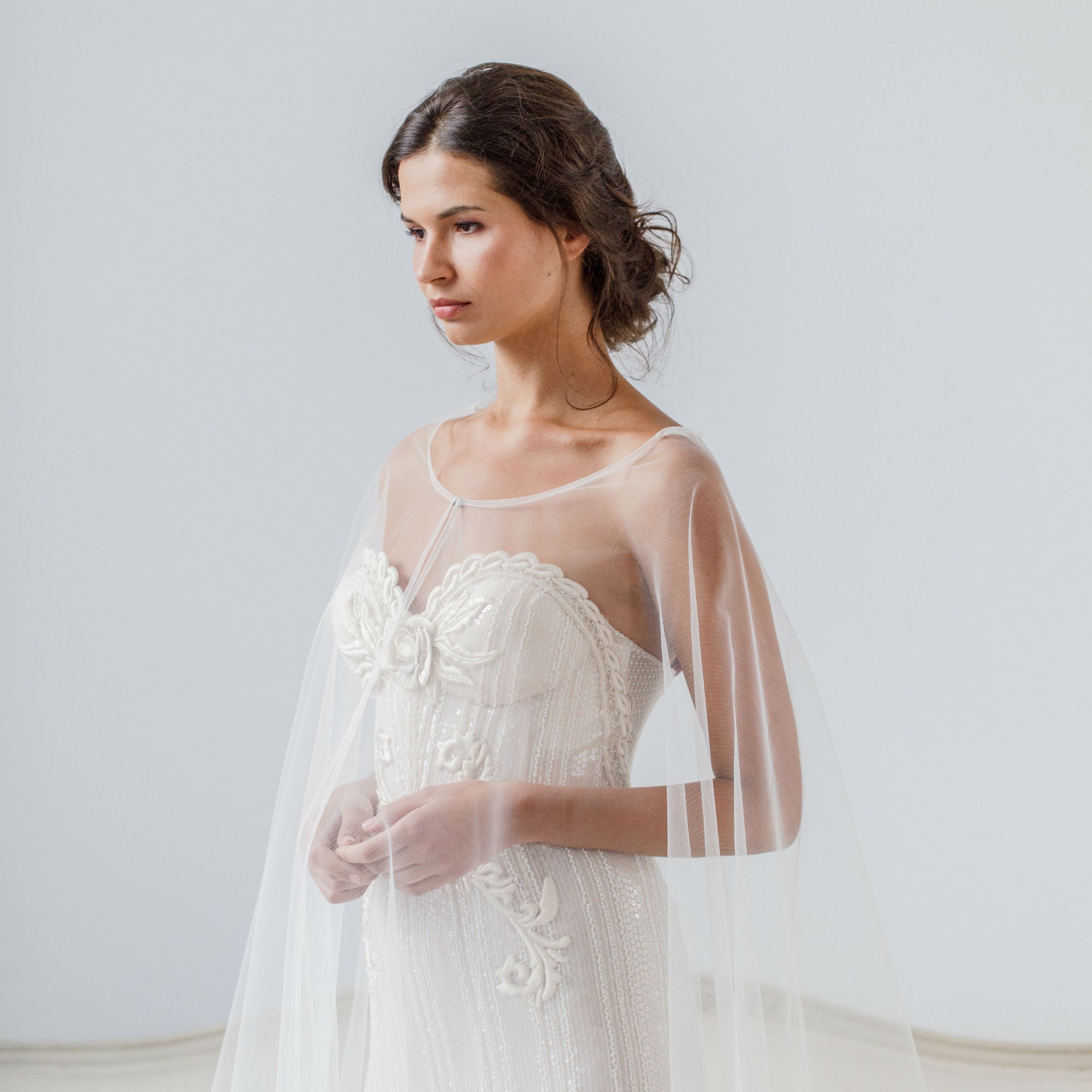 If you are after an alternative to a veil then a full tulle cape like our Imogen is the best option. This cape comes in fingertip, ballet, floor, church and cathedral and with a high or low neckline so you can choose which best compliments your dress. To provide some cover in a church you could go for a lace wrap like Charis which can also be worn for your getting ready shots as an alternative to a dressing gown. To instantly turn your wedding dress into an evening gown try one of our hand beaded capelets like Edwina or Jolie.