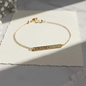 Our Coordinates Bar Bracelet is engraved with the latitude and longitude of your chosen location — where you met, married, travelled, or call home.