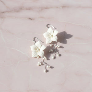 The Hazel earrings combine freshwater pearls, seed beads and handcrafted clay flowers on a delicate wire vine. Lightweight and comfortable, they bring a botanical elegance to your bridal look without feeling heavy or elaborate. Pairs beautifully with our floral hair accessories or pearl hair pins. A piece you'll treasure long after your wedding day.