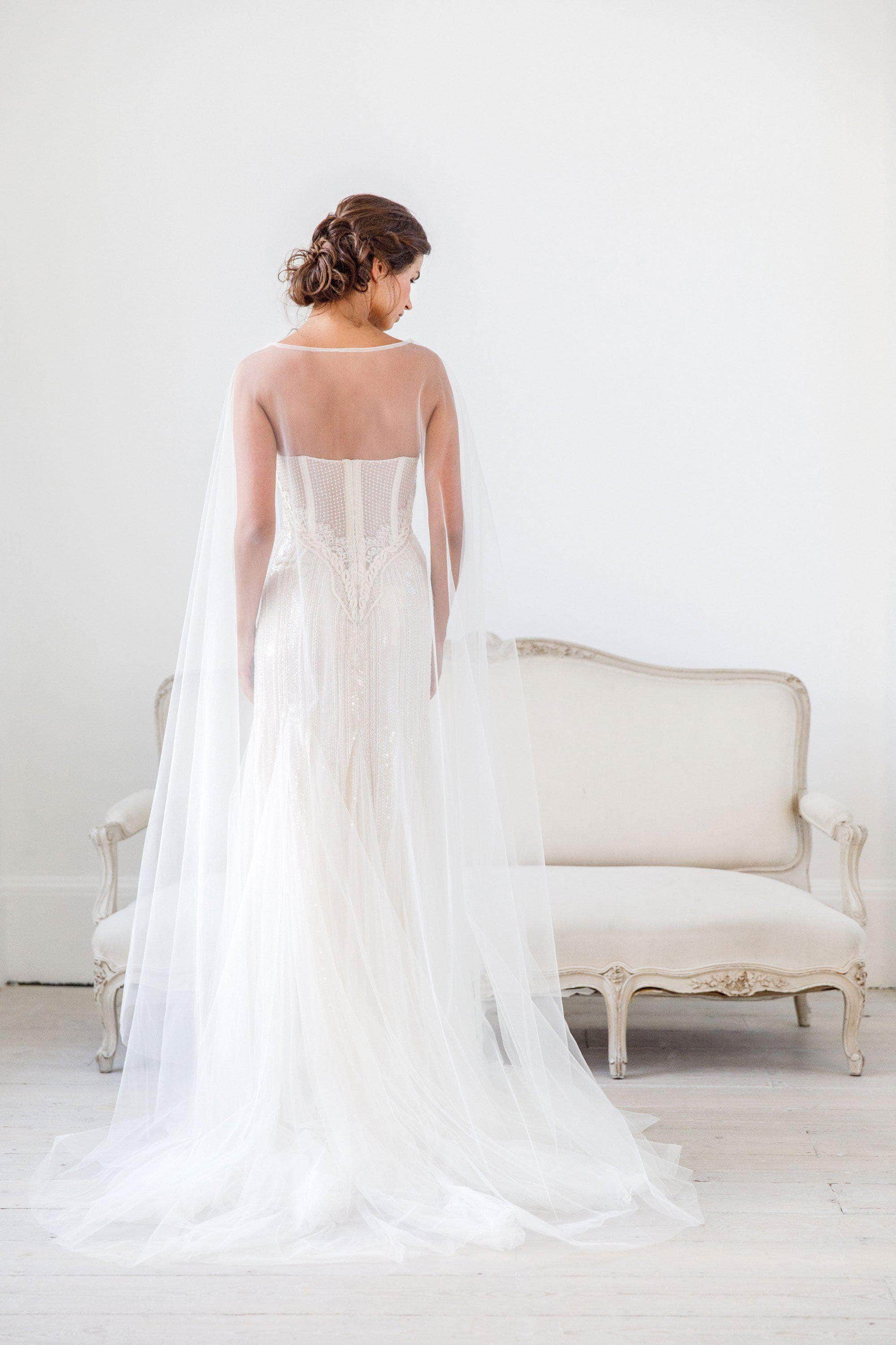 Browse our fingertip length veils and cathedral length veils to explore cape-style options.