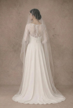 This handcrafted drop veil features a delicate cut edge and includes a 72cm blusher that lifts beautifully after your ceremony. Made with your choice of traditional tulle, silk style tulle or Italian tulle. An heirloom piece to treasure forever.