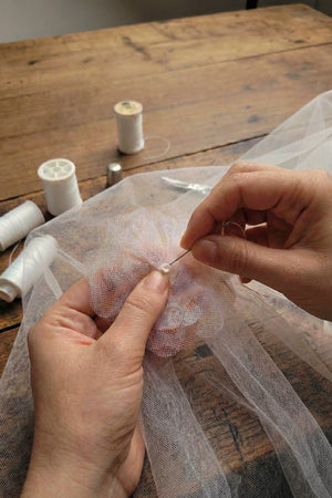 Handle gently and store flat when possible to maintain the shape of the tulle flowers. The cut edge finish and delicate embellishments are designed to be durable, but avoid catching on jewellery or rough surfaces during wear.