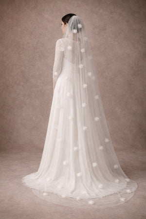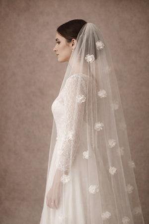 Hand-pressed tulle flowers are scattered across the veil for a textured, 3D floral effect.