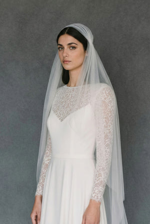 This two-tier version features a top layer (blusher) which can be worn over the face for your walk down the aisle, or swept back to create a beautiful, tiered look.