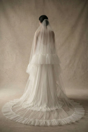 Add texture and volume to your bridal look with this two-tier ruffle edge veil. Hand-finished with a wide, gathered tulle trim, this veil offers a playful yet sophisticated take on the classic bride.