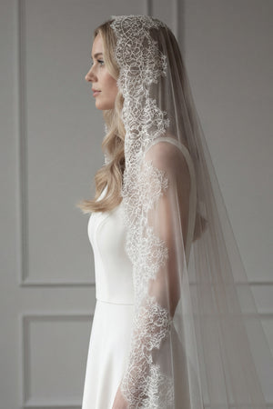 Type: Mantilla veils are single tier veils that sit just back from the hairline or at the crown of the head. A comb is hand sewn to the underneath of the lace. Mantilla veils have no gather in them. They are sometimes called Spanish veils.