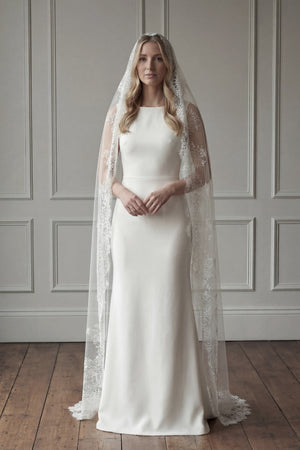 The Catalina is a breathtaking statement mantilla veil, defined by its wide, soft French eyelash lace that frames the face and shoulders with luxurious detail. The generous lace border ripples beautifully as you move, lending an unmistakably romantic, Spanish-inspired silhouette. Cut from our silk-style tulle, the veil drapes with a fluid, weightless quality that feels as effortless as it looks dramatic. Perfect for brides seeking timeless elegance with a bold, feminine edge, the Catalina transforms even the simplest gown into something unforgettable — handcrafted with care in our Bath studio..