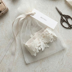 Your garter will arrive safe in one of our handmade lace dustbags. Choose to add a luxurious box to keep your garter safe for generations to come.thin.