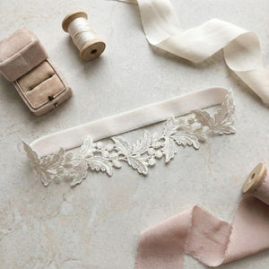 A super sleek wedding garter with beautiful leaf lace and ivory velvet elastic.