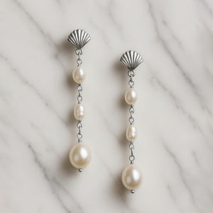 Hand‑made in our Somerset studio, these earrings pair a sculpted Art‑Deco shell stud with three perfectly graduated freshwater pearls. The result is a light, fluid drop that moves with you—ideal for brides, bridesmaids, or any occasion that calls for understated luxury.