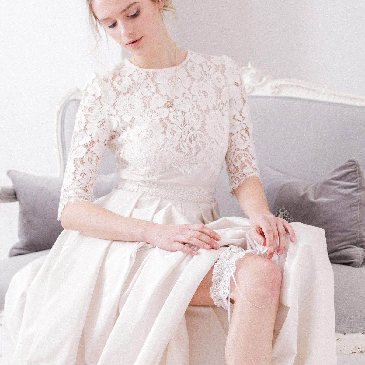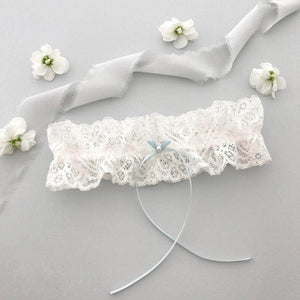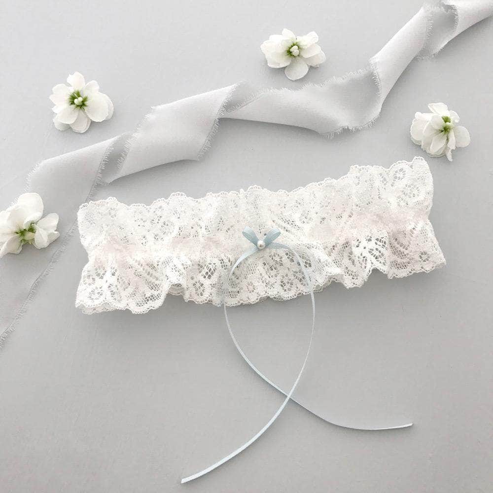 Vintage style pale ivory lace wedding garter. The 'something blue' is the delicate sky blue satin ribbon bow; it's hand tied and stitched with a shimmering pearl.