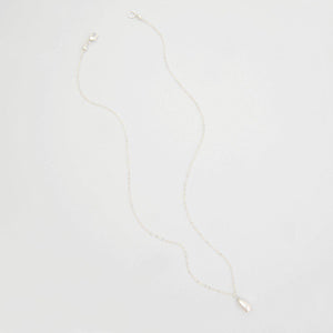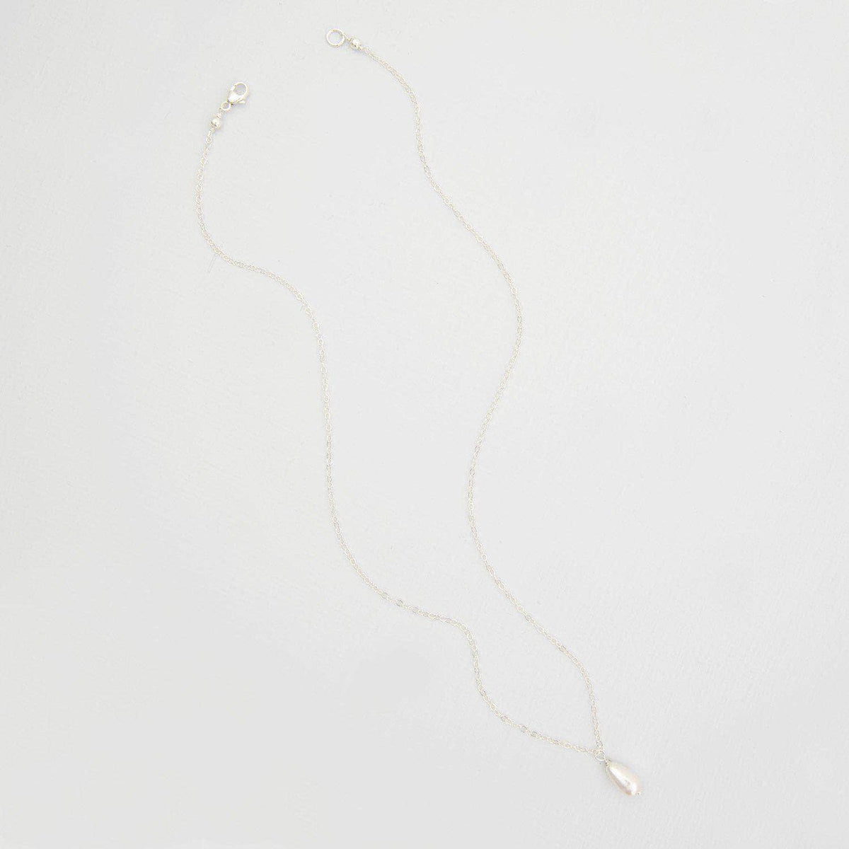 A single glass pearl sways on a chain. Hermione is designed to match our pearl drop wedding earrings.