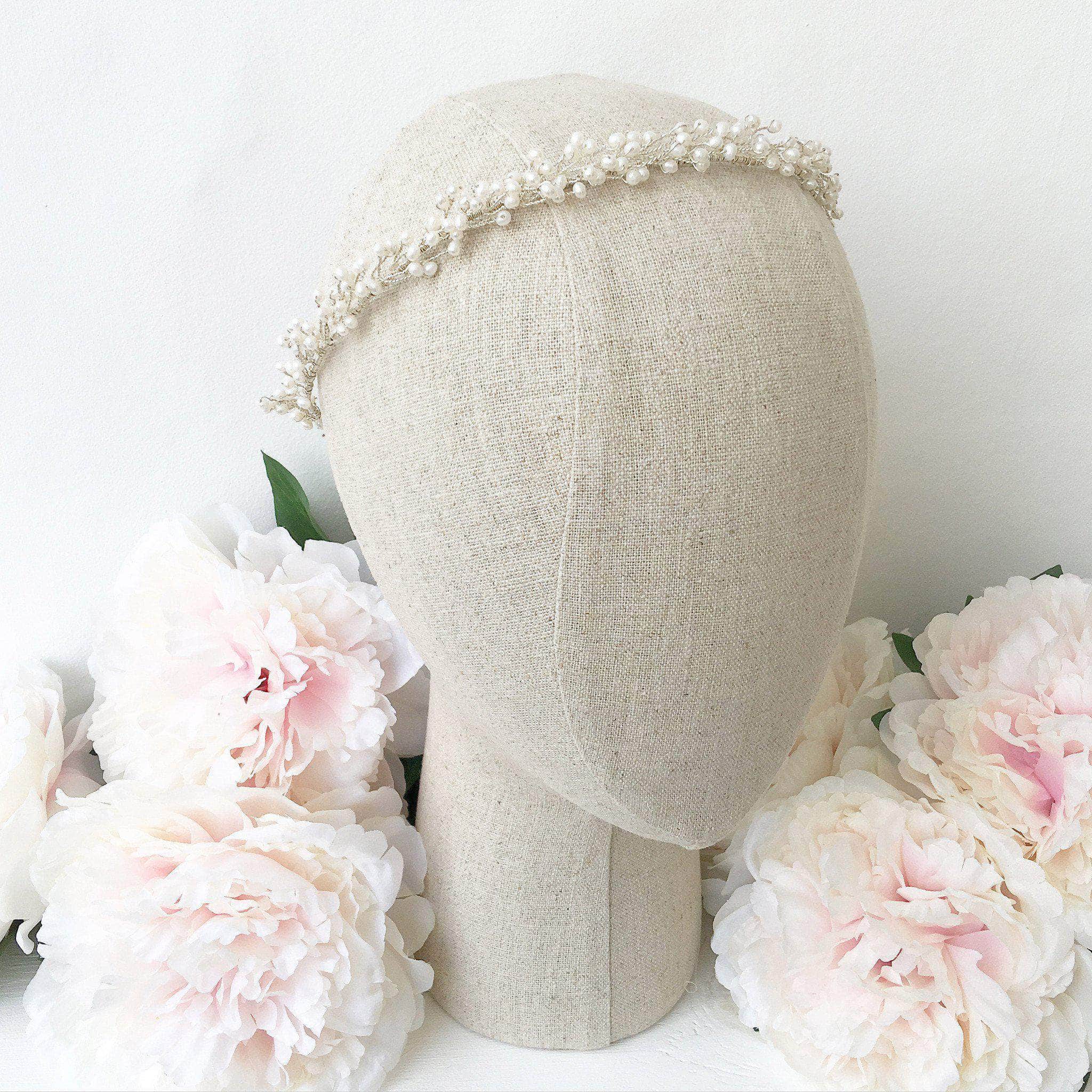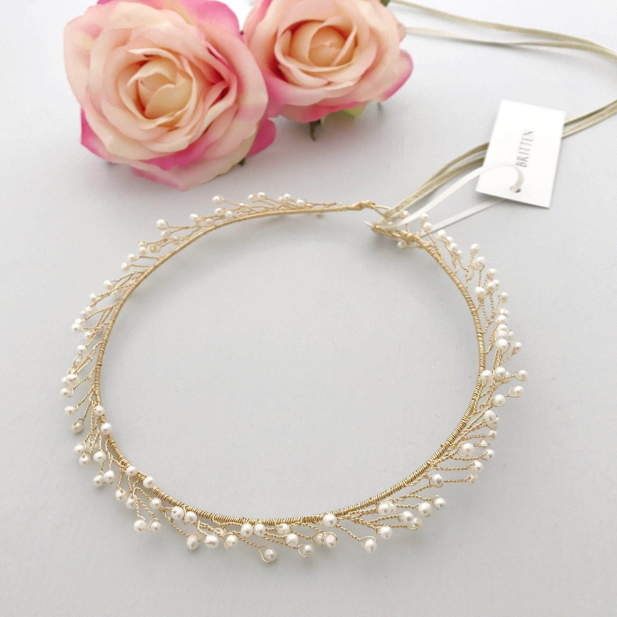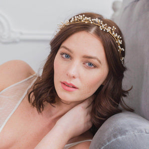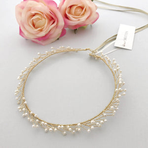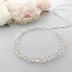 A bridal crown style wedding hair vine of freshwater pearls wind their way around gold or silver plated wire.