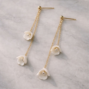 The Anais earrings feature delicate handcrafted clay flowers suspended from fine gold filled chains, each finished with a freshwater pearl at the centre. Light, fluid and quietly romantic, they move beautifully as you do—adding a soft botanical detail without overwhelming your look. Perfect for pairing with sheer veils or floral hair pieces, they bring an effortless elegance to modern bridal styling. A piece to treasure long after your wedding day.