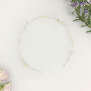 'Elsa' is a delicate flexible hair vine created from freshwater pearls, pretty ivory flowers and gold plated beads all hand twisted onto gold plated wire and finished with an ivory ribbon.