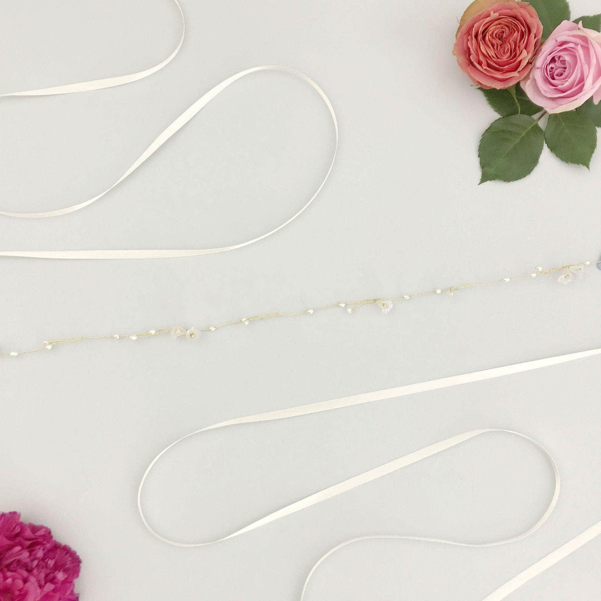Entirely hand made in our ancient workshop just outside Bath, England and delivered worldwide. Elsa can be worn as shown or twisted through your hair. The vine comes with ivory ribbon sewn to the loops, you can either use this to tie it to your head or you can remove the ribbon and simply pin the vine into place. We will include a few brunette bobby pins for this purpose, let us know if you would rather have blonde or black.