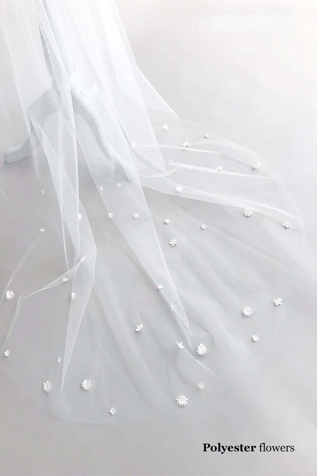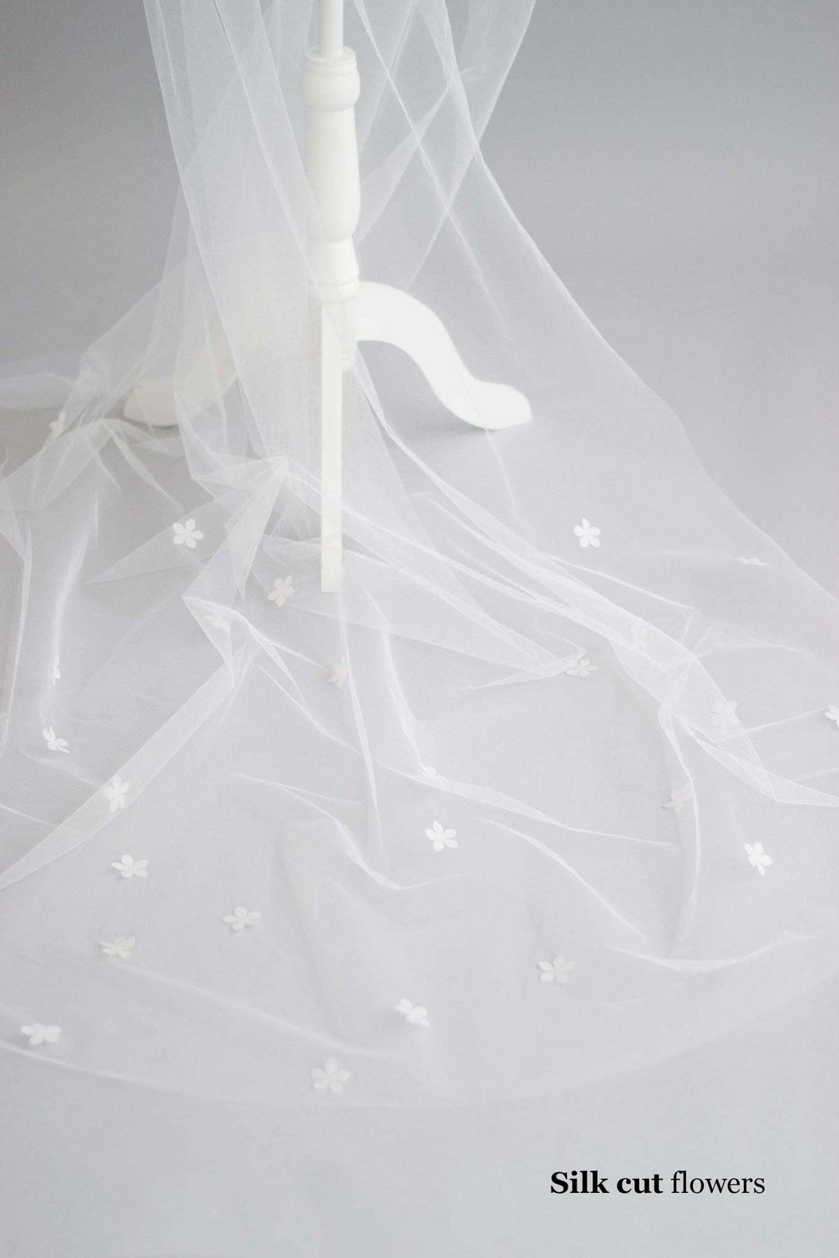 Material and Colour: This veil is available in off-white and ivory and is made from our traditional tulle. You can choose from polyester flowers or hand cut silk flowers.