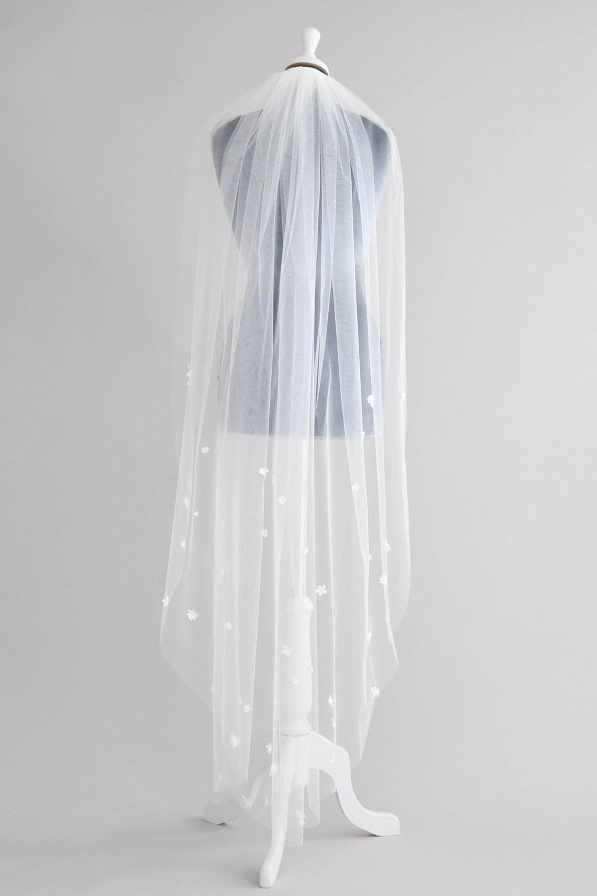 The Flower Wedding Veil is a classic single tier veil with a sprinkling of hand stitched flowers around the train.