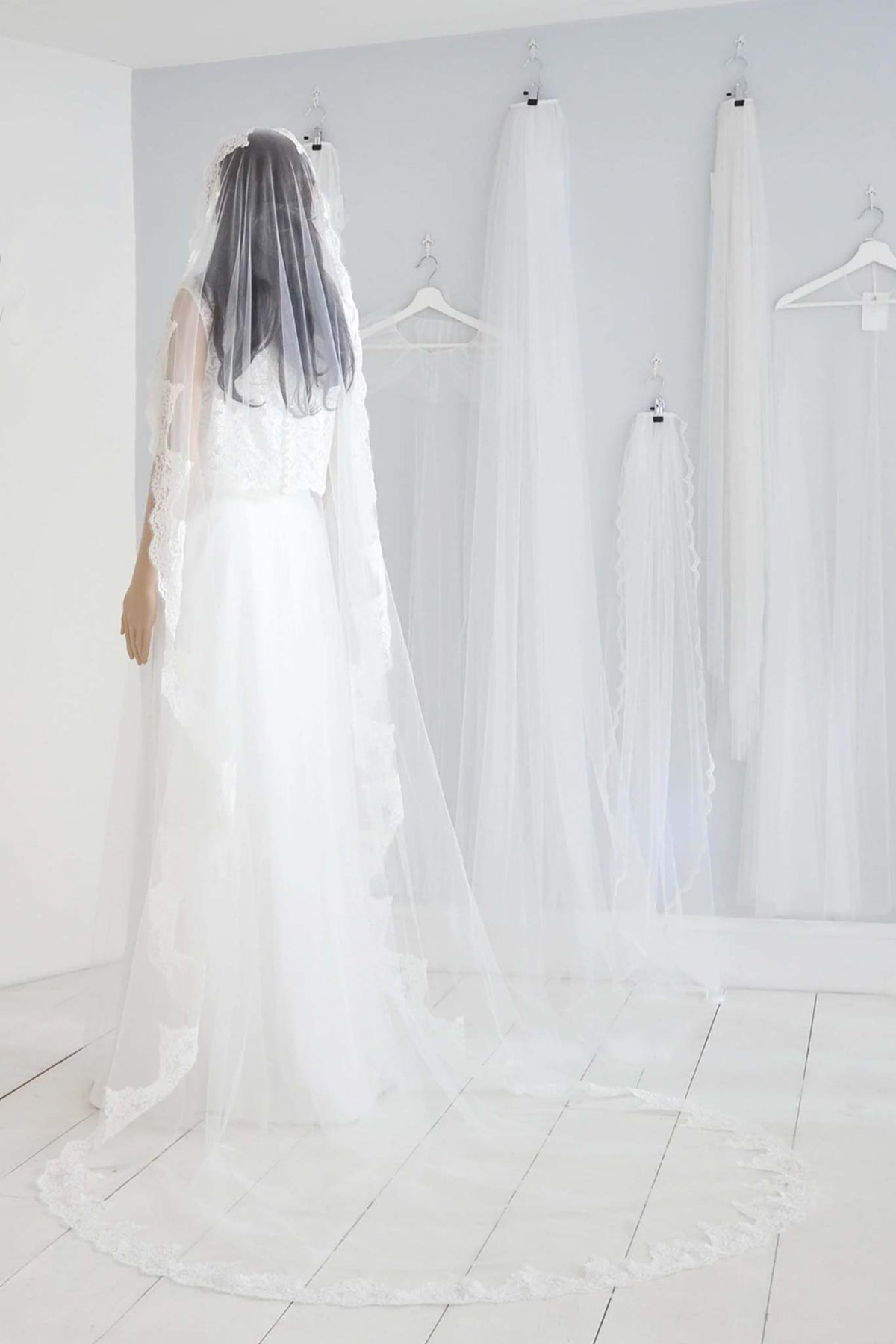 Length: Our finger tip length veils are 122cm long, ballet length veils are 150cm, floor length veils are 200cm long, church length veils are 250cm and cathedral length veils are 300cm.