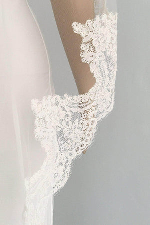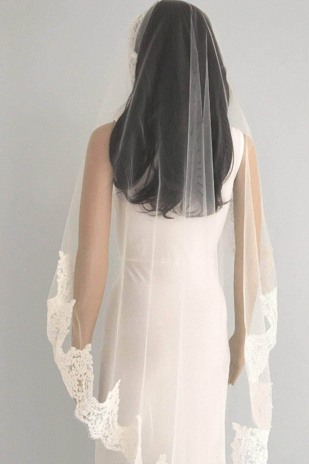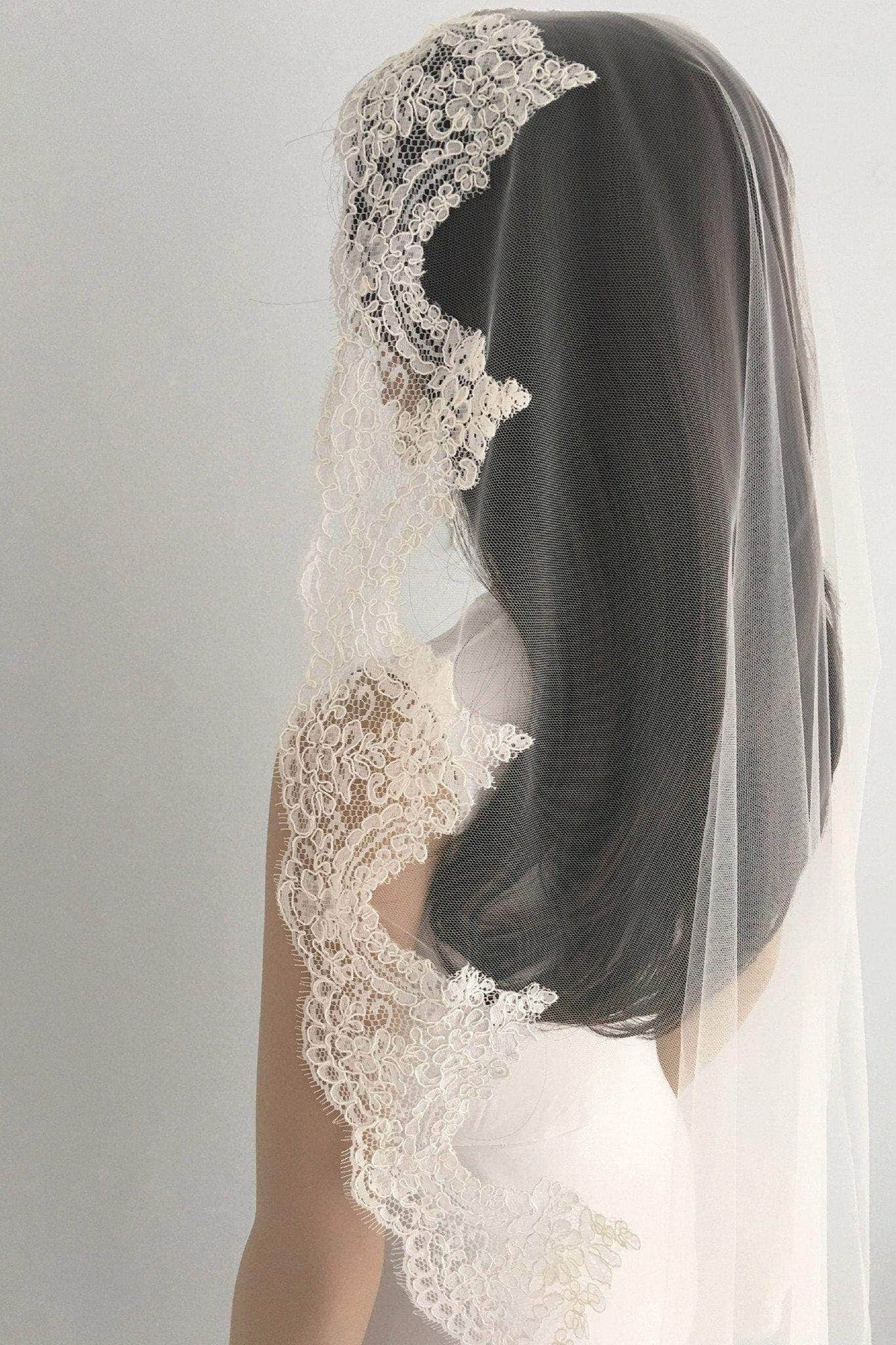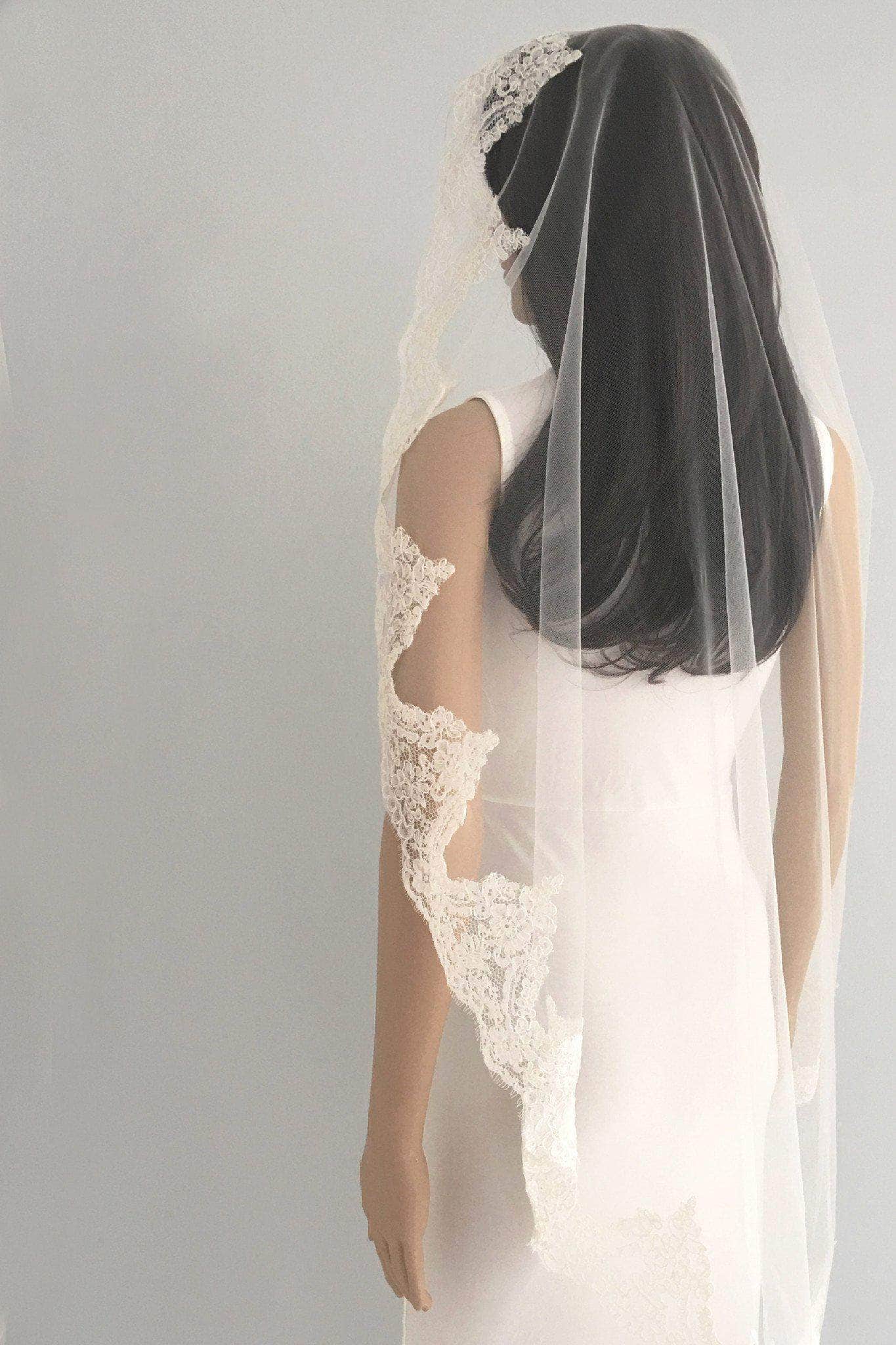 Type: Mantilla veils are single tier veils that sit just back from the hairline or at the crown of the head. A comb is hand sewn to the underneath of the lace. Mantilla veils have no gather in them.They are sometimes called Spanish veils.