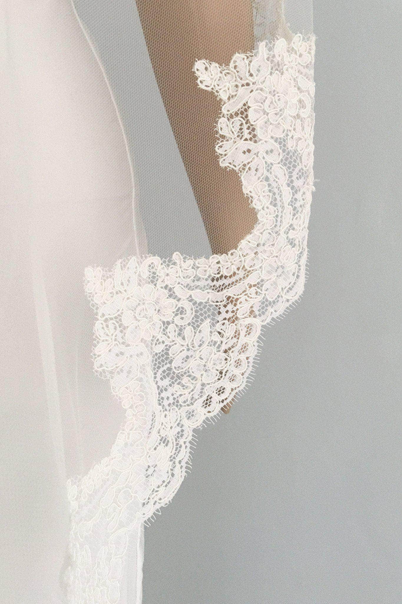 'Adela' is a classic and beautiful hand crafted mantilla wedding veil with beautiful lace edge all the way around. It is super sheer and light and allows the back of your dress to show completely.