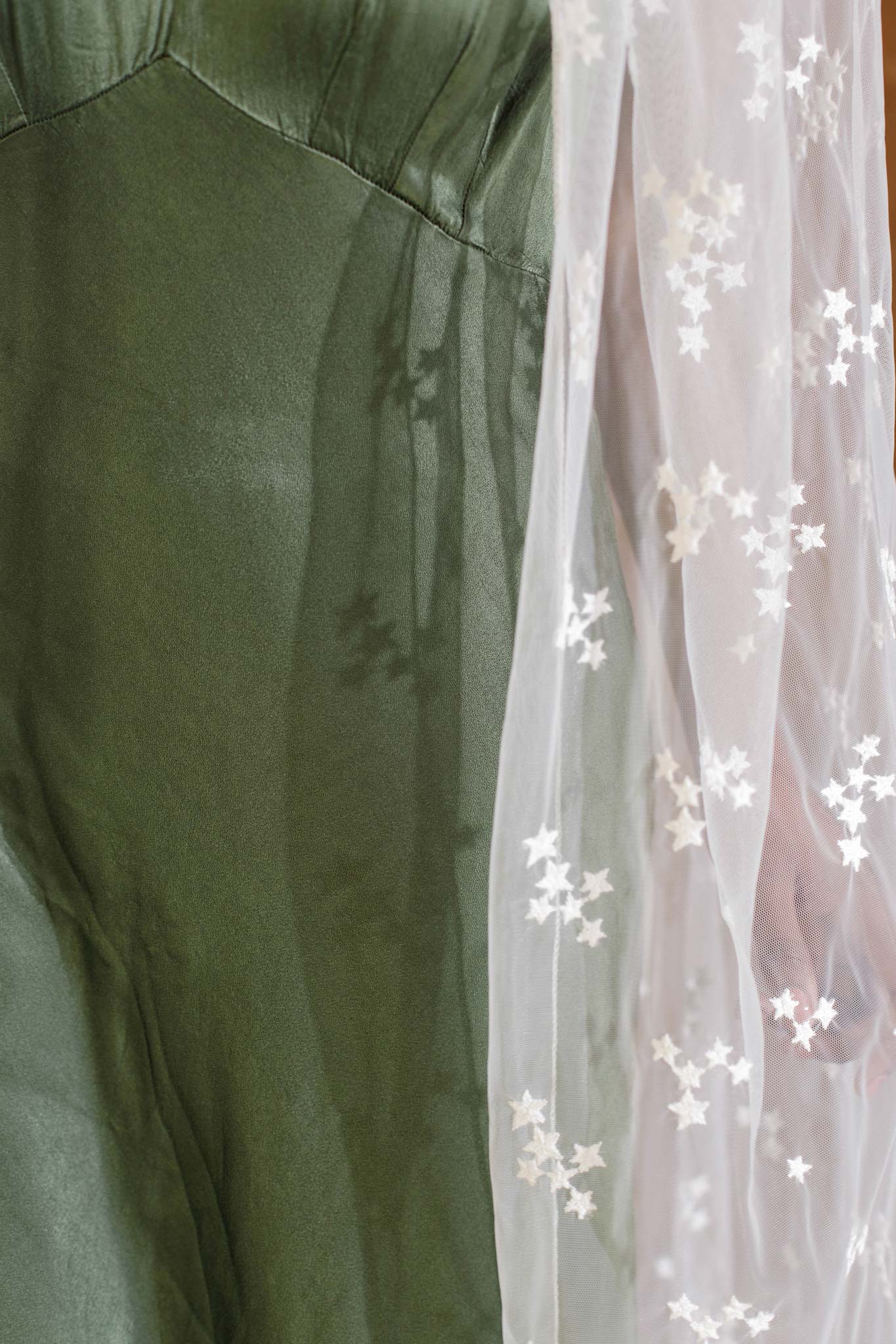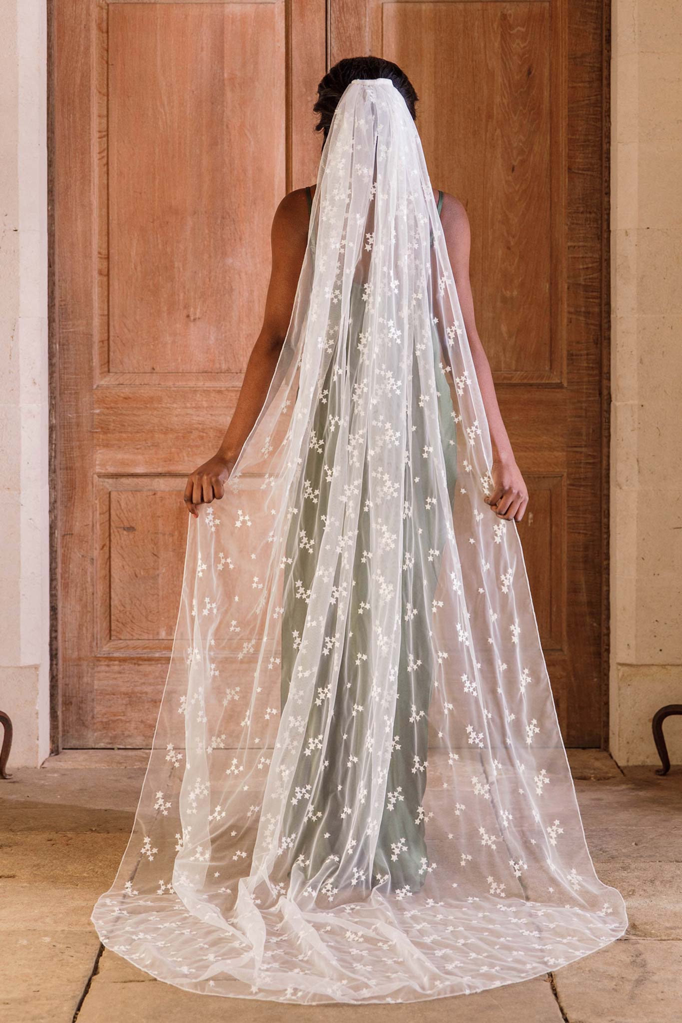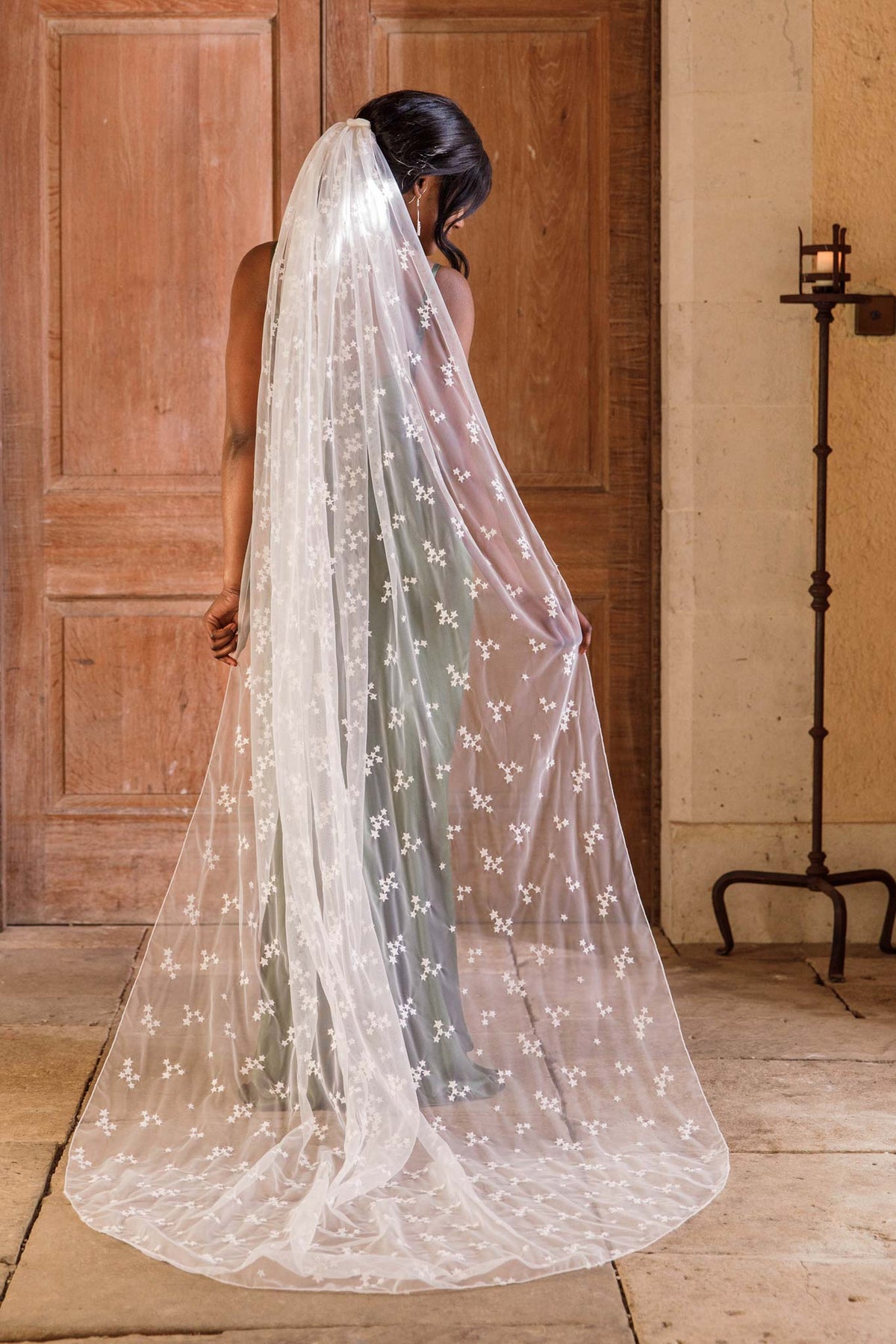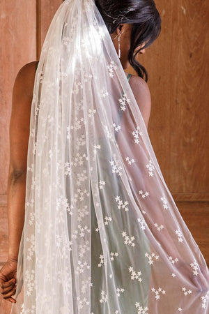 Edge & Finish: This veil is covered in tiny embroidered stars and has a pencil edge.