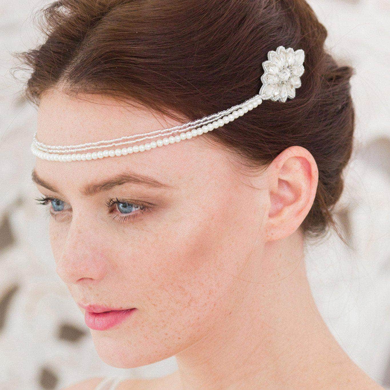 'Cervé' is two 1920's inspired wedding hair combs connected by a chain of beautiful pearls and two of tiny sparkling seed beads.