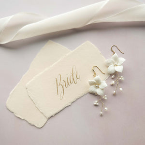 The Hazel earrings combine freshwater pearls, seed beads and handcrafted clay flowers on a delicate wire vine. Lightweight and comfortable, they bring a botanical elegance to your bridal look without feeling heavy or elaborate. Pairs beautifully with our floral hair accessories or pearl hair pins. A piece you'll treasure long after your wedding day.