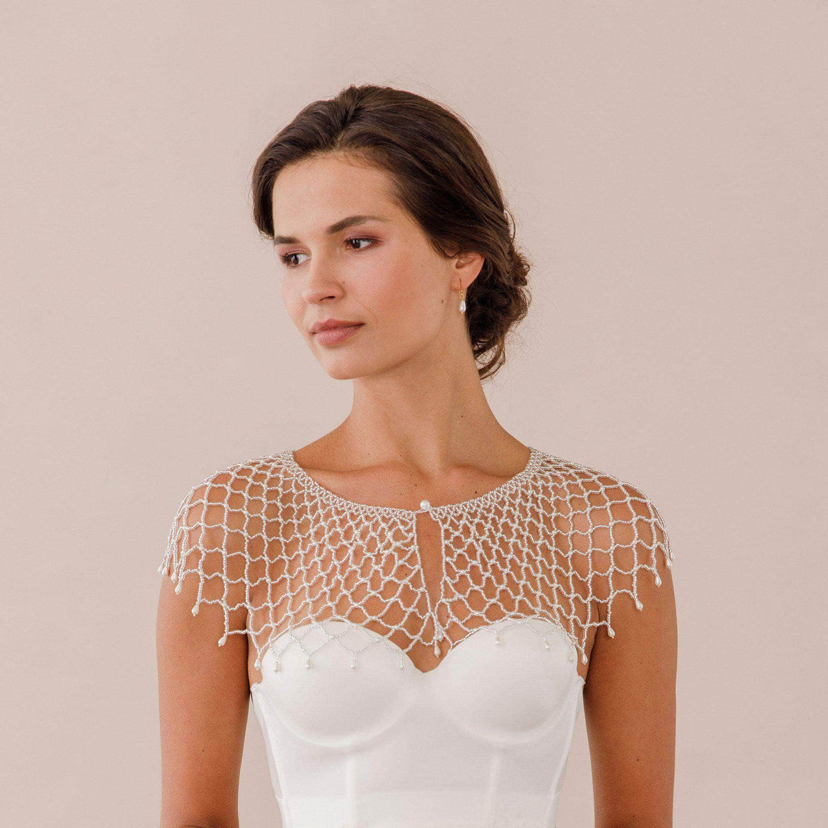 Twinkling silver beads and glass beads are hand beaded to create this stunning capelet.