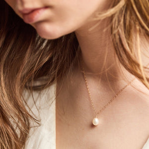 The pearl sits just below the collarbone, making it a flattering choice for most necklines. Lightweight and comfortable, it's an easy piece to wear throughout the day.