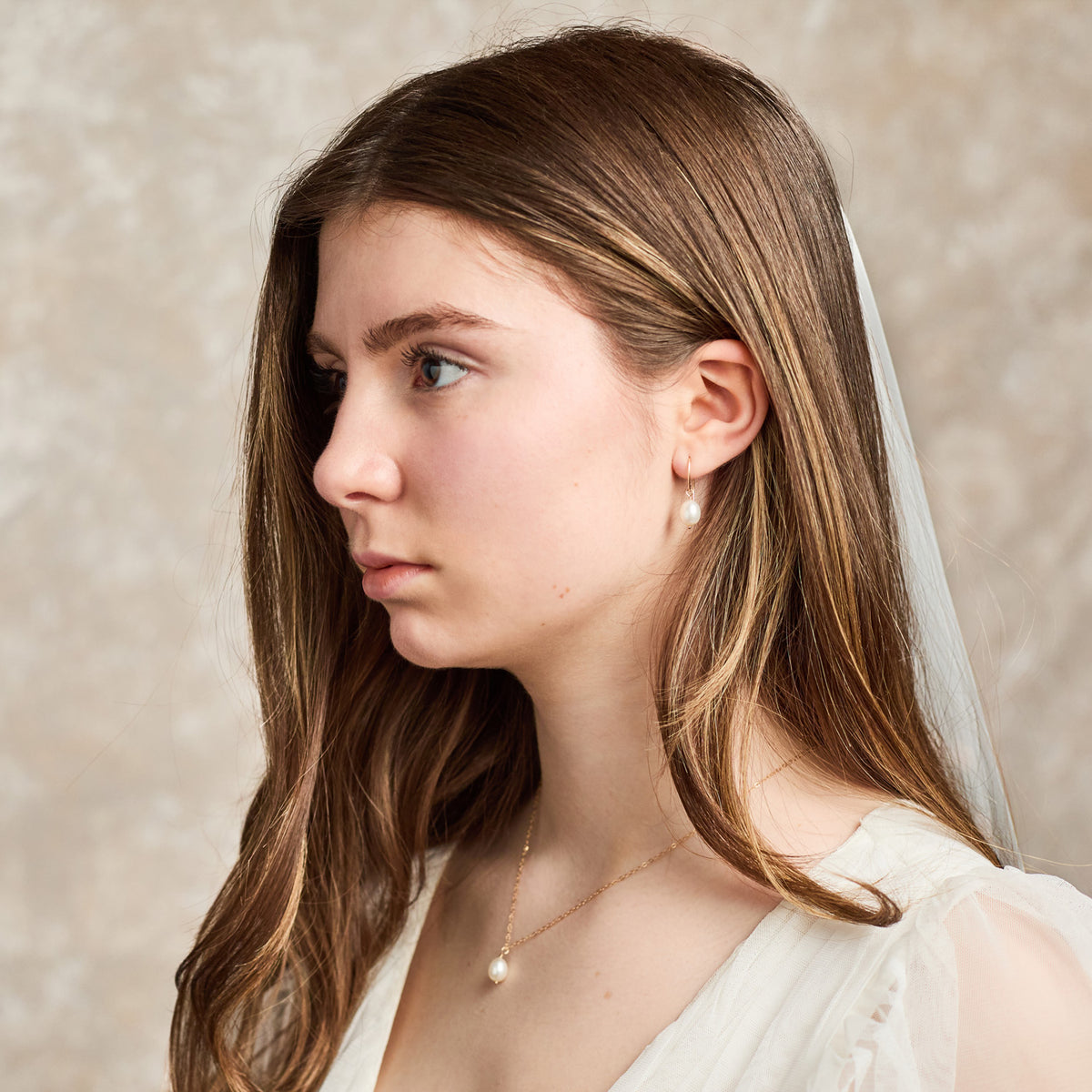 The Rebecca necklace features a single freshwater pearl suspended from a fine chain — understated, timeless, and easy to wear. The natural ivory tone of the pearl works beautifully with a range of dress styles